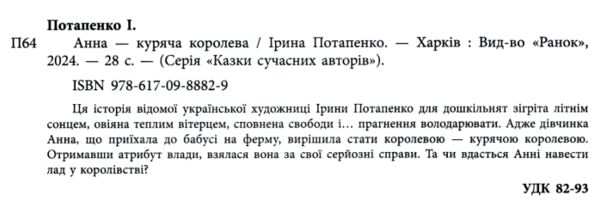 Ця історія відомої української художниці Ірини Потапенко для дошкільнят зігріта літнім сонцем, овіяна теплим вітерцем, сповнена свободи і… прагнення володарювати. Адже дівчинка Анна, що приїхала до бабусі на ферму, вирішила стати королевою — курячою королевою. Отримавши атрибут влади, взялася вона за свої серйозні справи.
