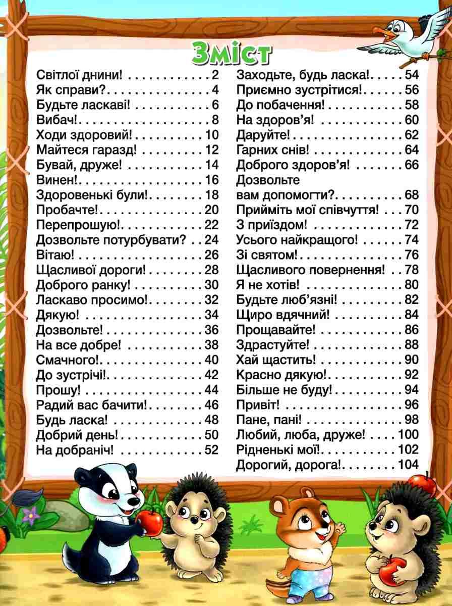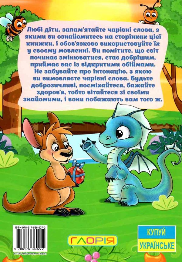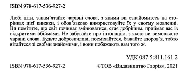 Дорогі діти, запам'ятайте чарівні слова, з якими ви познайомитеся на сторінках цієї книги, і обов'язково використовуйте їх у своїй мові. Ви помітите, що світ починає змінюватися, стає добрішим, приймає вас з обіймами. Не забувайте про інтонацію, з якою ви вимовляєте чарівні слова. Будьте доброзичливі, посміхайтеся, бажайте здоров'я, тобто вітайтеся зі своїми знайомими, і вони побажають вам того ж.