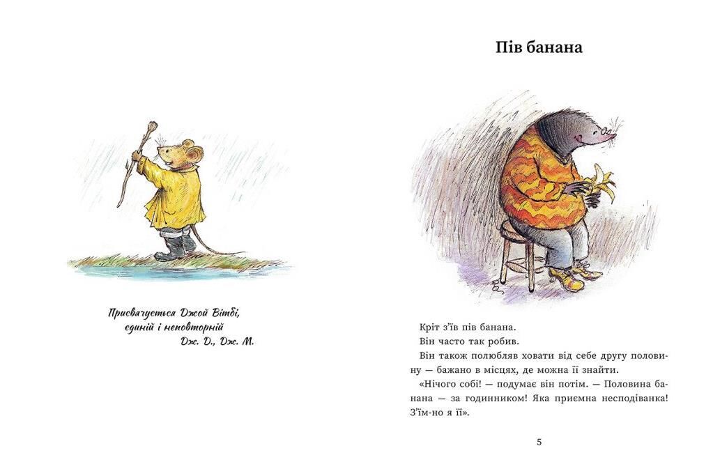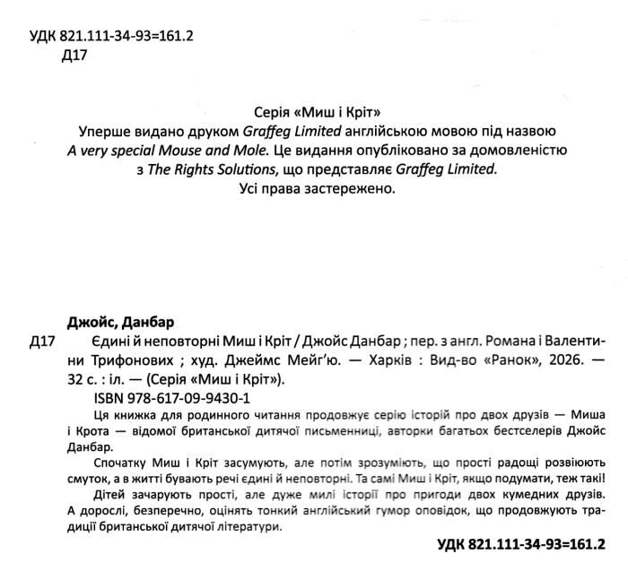 Ця книжка для родинного читання продовжує серію історій про двох друзів — Миша і Крота — відомої британської дитячої письменниці, авторки багатьох бестселерів Джойс Данбар. Спочатку Миш і Кріт засумують, але потім зрозуміють, що прості радощі розвіюють смуток, а в житті бувають речі єдині й неповторні. Та самі Миш і Кріт, якщо подумати, теж такі!