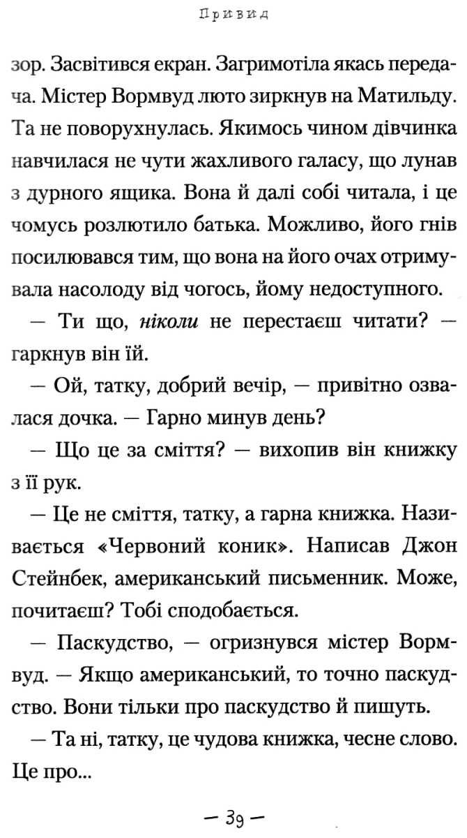 «Матильда» — найпопулярніша книга Роальда Дала, одного з літературних батьків Джоан Ролінґ — авторки «Гаррі Поттера»... Матильда — геніальна дитина, проте її родичі так не вважають. Для них вона — зайвий клопіт, головний біль. І Матильда вирішує перевиховати своїх обмежених і зациклених на собі родичів, а заодно й жахливу директорку школи пані Транчбул... 1988 року «Матильду» було визнано найкращою книжкою для дітей.
