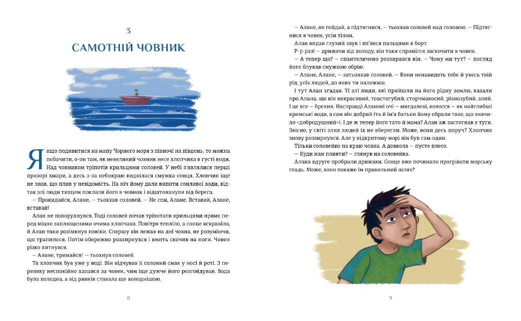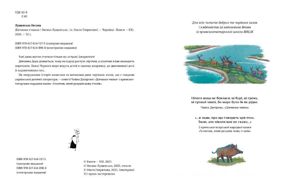 Такі дива могли статися тільки на острові Джарилгач! Дівчинка Дора дізнається, чому на її руці ростуть пір’їнки, а хлопчик Алан знаходить порятунок. Хвилі Чорного моря ведуть дітей в одному напрямку: до дивовижної долі й надзвичайних сил... Ця зворушлива історія написана за мотивами двох чарівних казок, що є спадком української дитячої літератури, — повісті Чайки Дніпрової «Дівчинка-чайка» і кримсько-татарської народної казки «Хлопчик, який розумів мову птахів».