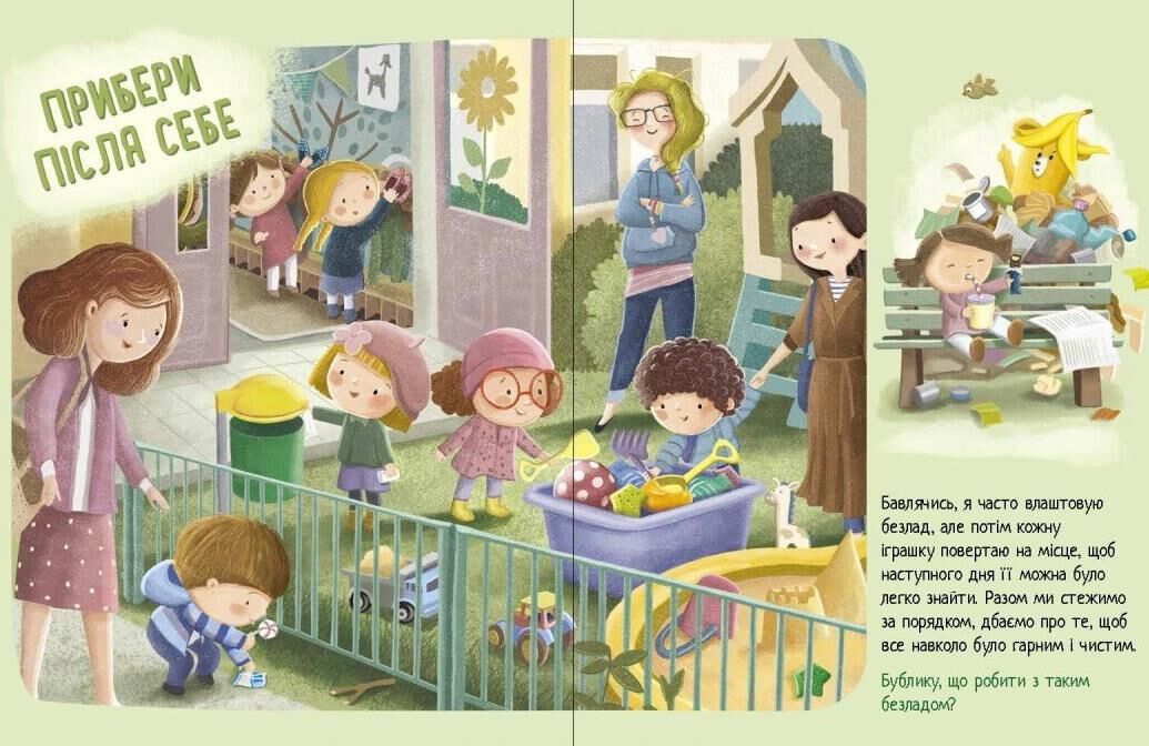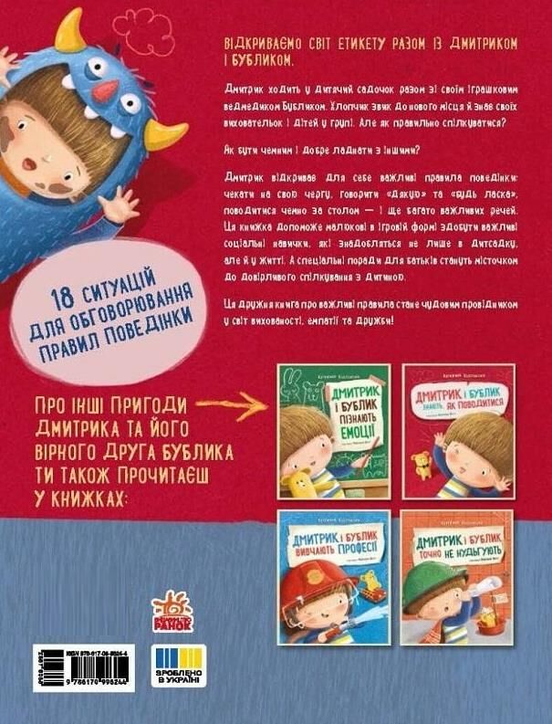 Дмитрик росте й пізнає важливі правила поведінки. Разом з іграшковим ведмедиком Бубликом він вчиться бути ввічливим, дотримуватися гарних манер і знаходити спільну мову з іншими. У книжці представлено ситуації, знайомі малюкам з життя вдома та в дитячому садочку, які допоможуть зрозуміти, чому правила дуже важливі. Книжка в дружній ігровій формі допоможе дітям опанувати корисні навички комунікації, а спеціальні поради для батьків стануть місточком до довірливого спілкування з дитиною.