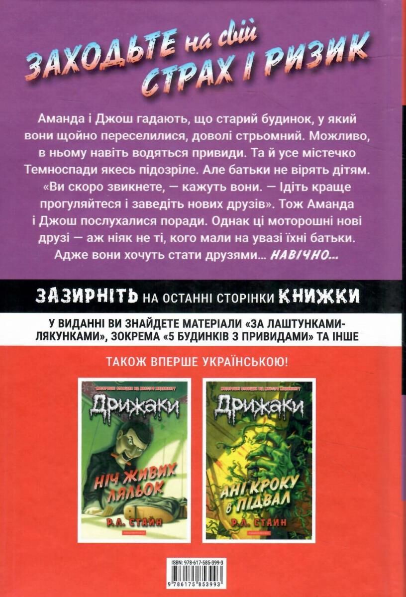 Аманда і Джош гадають, що старий будинок, у який вони щойно переселилися, доволі стрьомний. Можливо, в ньому навіть водяться привиди. Та й усе містечко Темноспади якесь підозріле. Але батьки не вірять дітям. «Ви скоро звикнете, — кажуть вони. — Ідіть краще прогуляйтеся і заведіть нових друзів». Тож Аманда і Джош послухалися поради. Однак ці моторошні нові друзі — аж ніяк не ті, кого мали на увазі їхні батьки. Адже вони хочуть стати друзями… навічно… Роберт Лоуренс Стайн, також відомий як Р.Л. Стайн і «Веселий Боб Стайн», — американський письменник, істинний «король дитячого горору», що здобув всесвітню славу, підкоривши юне читацтво сотень країн. Стайн, якого часто називають «Стівеном Кінґом дитячої літератури», — автор десятків популярних горор-новел, зокрема легендарних серій «Дрижаки», «Гнила школа», «Приводи для привидів», «Кімната кошмарів» і «Вулиця Жахіть».