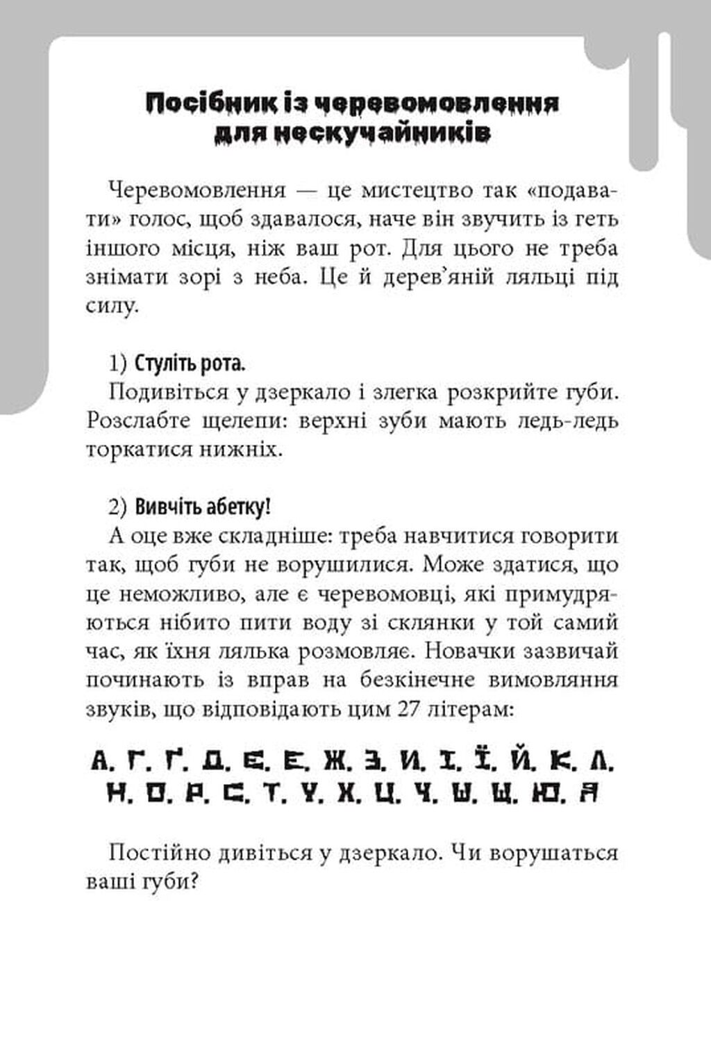 ...Близнючки Лінді і Кріс знаходять на звалищі черевомовницьку ляльку. Лінді «рятує» її, бере собі й називає Ляскалом. Але Кріс шаленіє від заздрощів. Так нечесно! Чому всі радощі-веселощі і вся увага завжди дістаються Лінді? Кріс вирішує завести ляльку й собі. Вона покаже цій Лінді! Аж тут починає коїтися щось дивне. Мерзенне. Моторошне. Не може бути, щоб усе це чинила якась дерев’яна лялька! Чи, може, може?.. Роберт Лоуренс Стайн, також відомий як Р.Л. Стайн і «Веселий Боб Стайн», — американський письменник, істинний «король дитячого горору», що здобув всесвітню славу, підкоривши юне читацтво сотень країн. Стайн, якого часто називають «Стівеном Кінґом дитячої літератури», — автор десятків популярних горор-новел, зокрема легендарних серій «Дрижаки», «Гнила школа», «Приводи для привидів», «Кімната кошмарів» і «Вулиця Жахіть».