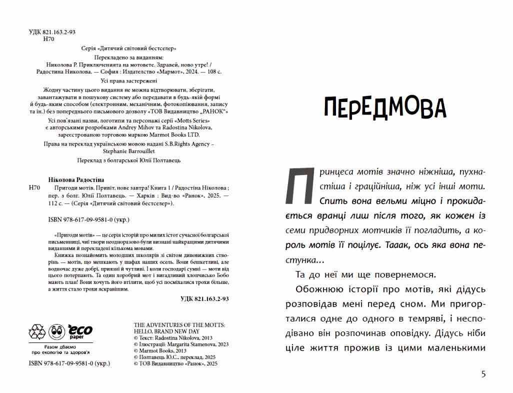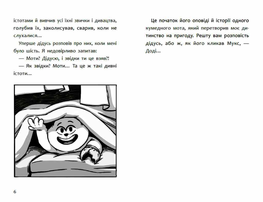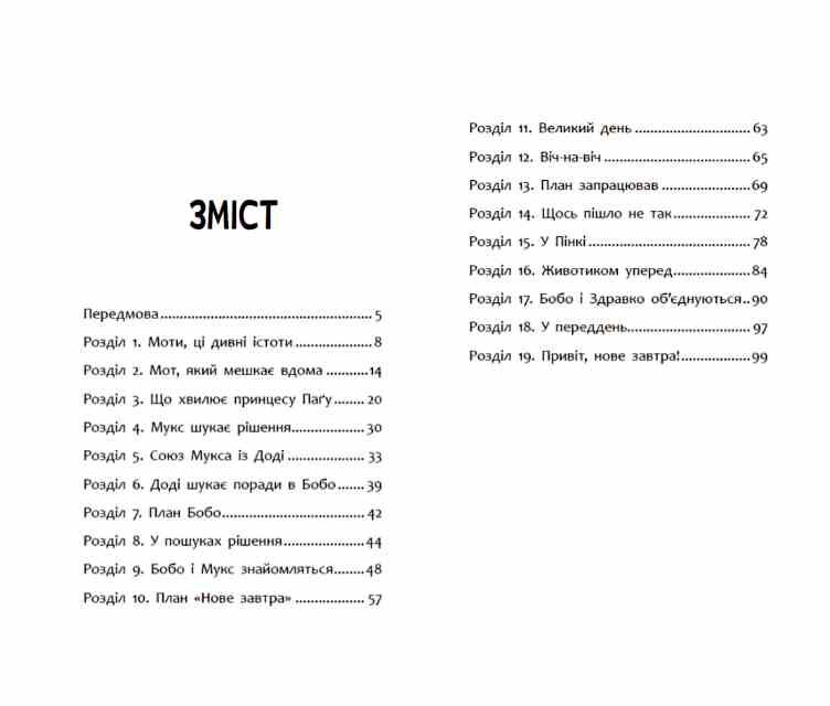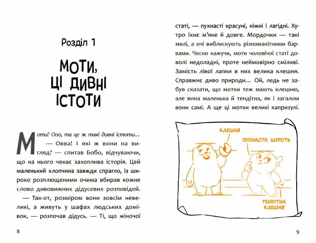 Книжка познайомить молодших школярів зі світом дивовижних створінь — мотів, що мешкають у шафах наших осель. Вони бешкетливі, але водночас дуже добрі, приязні й чутливі. І коли господарі сумні — моти від цього потерпають. Та один хоробрий мот і вигадливий хлопчисько Бобо мають план! Вони хочуть його втілити, щоб усі посміхалися трохи більше, а життя стало трохи яскравішим. Знайомтеся — це моти! Що за створіння такі, запитаєте ви? Вони дивовижні: маленькі, пухнасті й приязні. Люблять веселі барви світу й усмішки, а мешкають у… шафах наших з вами осель.