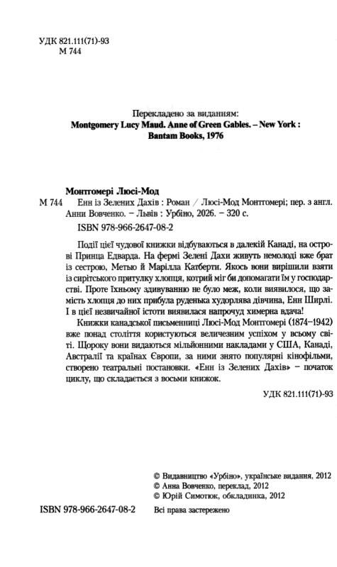 Події цієї чудової книжки відбуваються в далекій Канаді, на острові Принца Едварда. На фермі Зелені Дахи живуть немолоді вже брат із сестрою, Метью й Марілла Катберти. Якось вони вирішили взяти із сирітського притулку хлопця, котрий міг би допомагати їм у господарстві. Проте їхньому здивуванню не було меж, коли виявилося, що замість хлопця до них прибула руденька худорлява дівчина, Енн Ширлі. І в цієї незвичайної істоти виявилася напрочуд химерна вдача! Книжки канадської письменниці Люсі-Мод Монтгомері (1874-1942) вже понад століття користуються величезним успіхом у всьому світі. Щороку вони видаються мільйонами накладами у США, Канаді, Австралії та країнах Європи, за ними знято популярні кінофільми, створено театральні постановки. Енн із Зелених Дахів — початок циклу, що складається з восьми книжок.