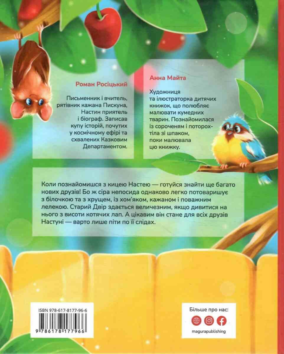 Коли познайомишся з кицею Настею — готуйся знайти ще багато нових друзів! Бо ж сіра непосида однаково легко потоваришує з білочкою та з хрущем, із хом’яком, кажаном і поважним лелекою. Старий Двір здається величезним, якщо дивитися на нього з висоти котячих лап. А цікавим він стане для всіх друзів Настуні — варто лише піти по її слідах.