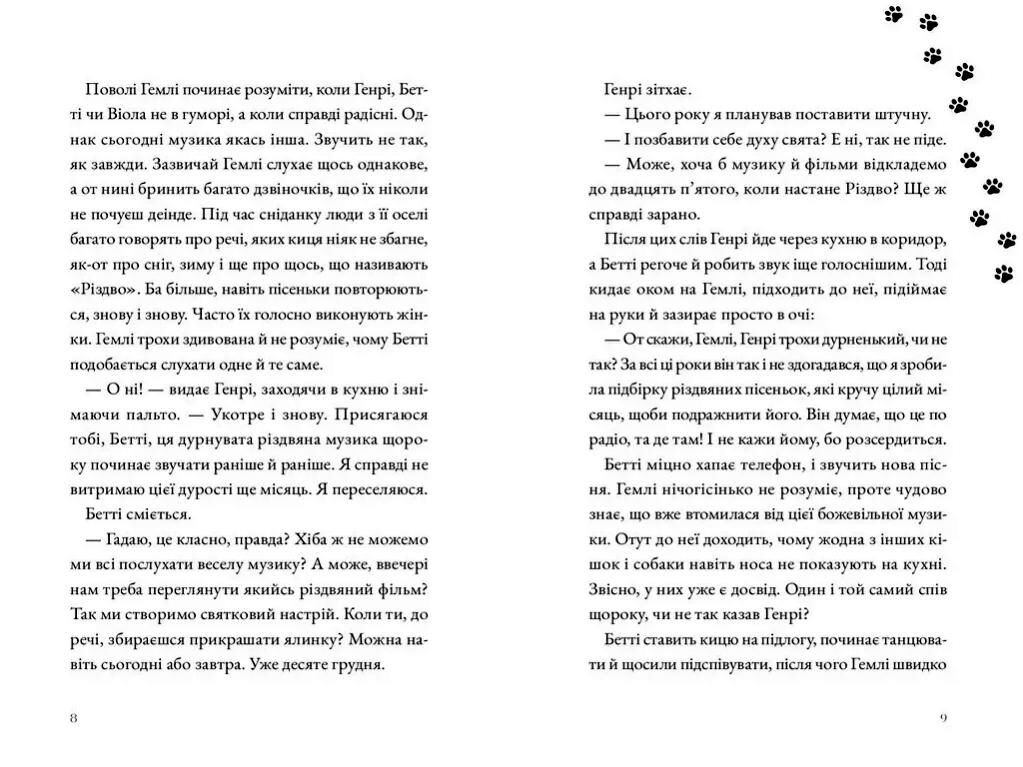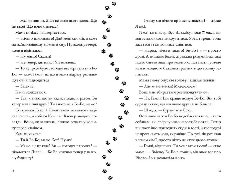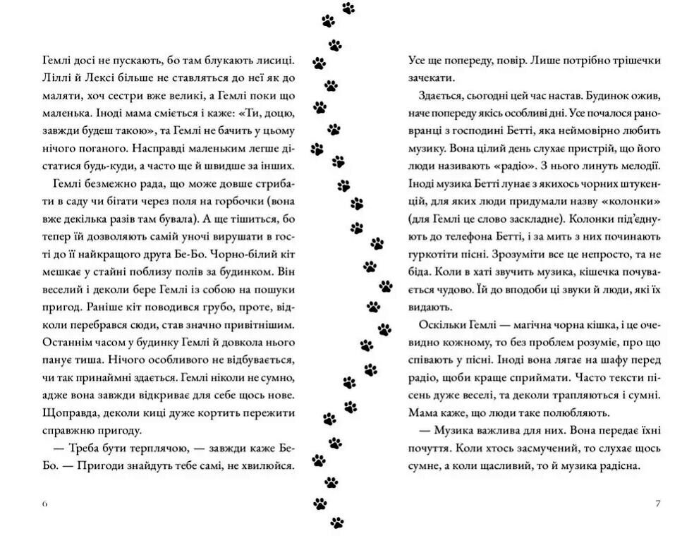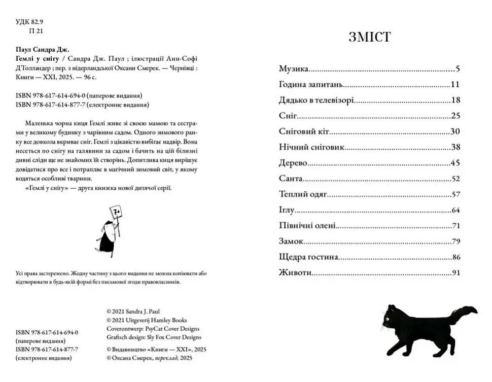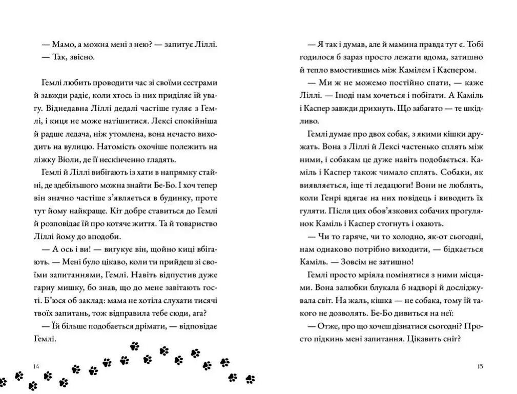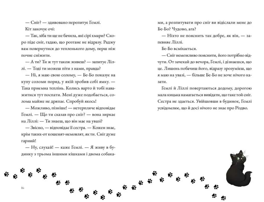 Маленька чорна киця Гемлі живе зі своєю мамою та сестрами у великому будинку з чарівним садом. Одного зимового ранку все довкола вкриває сніг. Гемлі з цікавістю вибігає надвір. Вона несеться по снігу на галявини за садом і бачить на цій білизні дивні сліди ще не знайомих їй створінь. Допитлива киця вирішує довідатися про все і потрапляє в магічний зимовий світ, у якому водяться особливі тварини. «Гемлі у снігу» — друга книжка нової дитячої серії.