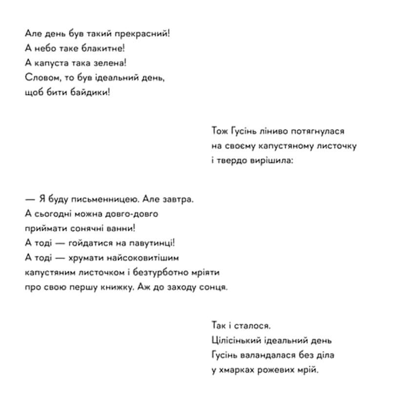 Зелена-зеленісінька Гусінь, та сама, що живе у капусті, надумала раптом стати письменницею. Хочу, каже, писати капустяні мемуари й прославитися на всенький городець! Гайда разом із Гусінню ловити Музу за хвоста, шукати пухнасте письменницьке перо, припасовувати суріпку замість письменницького капелюшка!