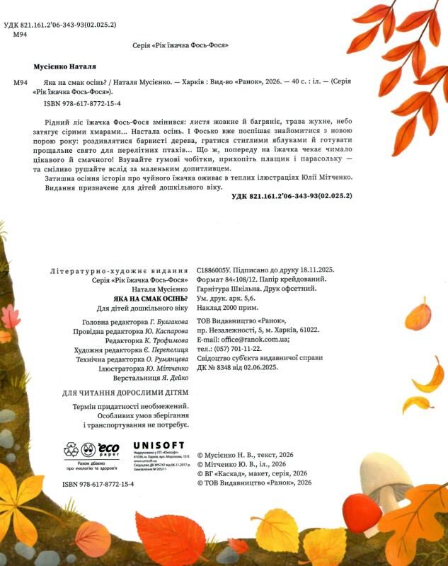 Ось і настала осінь. Навколо стільки нових барв, запахів, звуків... Допитливий їжачок Фось-Фось уже поспішає до лісу, щоб дізнатися все-все про цю пору року! Передусім — який вона має смак. Горіховий, жолудевий, гарбузового печива?.. Нумо наздоженемо малого Фоська й разом із ним смакуватимемо затишною порою. Зворушливе оповідання Наталі Мусієнко про маленького їжачка Фось-Фося торкнеться серця кожного. А казкові ілюстрації Юлії Мітченко подарують дітлахам справжнісінький осінній настрій.