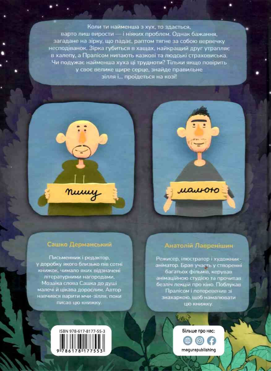 Коли ти найменша з хух, то здається, варто лиш вирости — і ніяких проблем. Однак бажання, загадане на зірку, що падає, раптом тягне за собою вервечку несподіванок. Зірка губиться в хащах, найкращий друг утрапляє в халепу, а Пралісом нипають казкові та людські страховиська. Чи подужає найменша хуха ці трудноти? Тільки якщо повірить у своє велике щире серце, знайде правильне зілля і… проїдеться на козі!