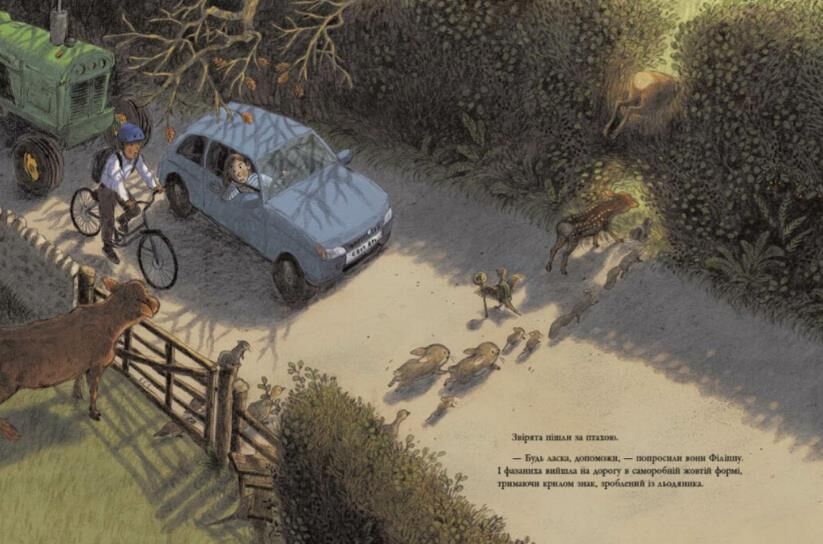Філіппа Фазан — невелика, але розумна птаха з лісу біля села Фергерст. Усе в її житті непогано — тільки от щоразу, коли їй потрібно перейти Старий Дубовий шлях, вона ледь не потрапляє під машину. Філіппі це набридло! Розмірковуючи, що ж із цим вдіяти, вона випадково помітила дещо цікаве: висока жінка в яскраво-жовтій формі стояла посеред дороги та зупиняла машини за допомогою знака на палиці! Нічого подібного Філіппа зроду не бачила!
