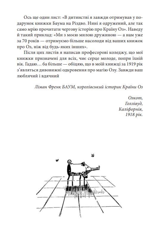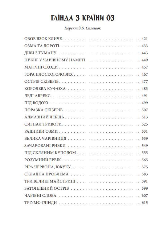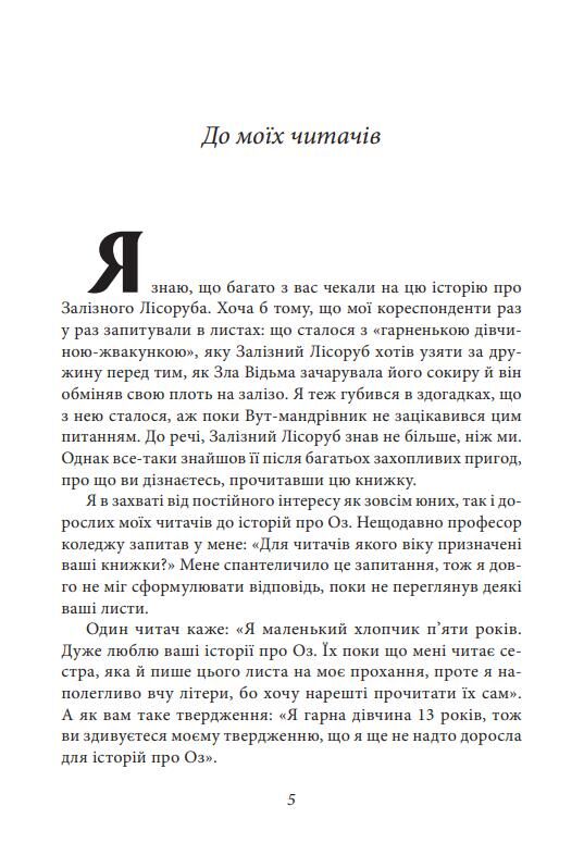 Ліман Френк Баум (1856–1919) — популярний американський письменник, всесвітньо відомий класик дитячої літератури, який створив чарівну країну Оз. Автор у своїх розповідях часто згадував імператора моргунів, якого звали Залізний Лісоруб. Читачі неабияк зацікавилися цим героєм, тому оповідач вирішив присвятити йому книжку «Залізний Лісоруб з Країни Оз». Головний герой має вирушити на пошуки зниклої нареченої, якій дав слово одружитися. Повість-казка «Чари Країни Оз» розповідає про дівчинку Дороті та Капітана Біла, Тротту, Скляного Кота. Друзі вирішують зробити незвичайний подарунок до дня народження. У казці «Глінда з Країни Оз» читачі разом із правителькою чарівної країни принцесою Озмою та її найкращою подругою Дороті вирушать до земель скізерів і плоскоголових.