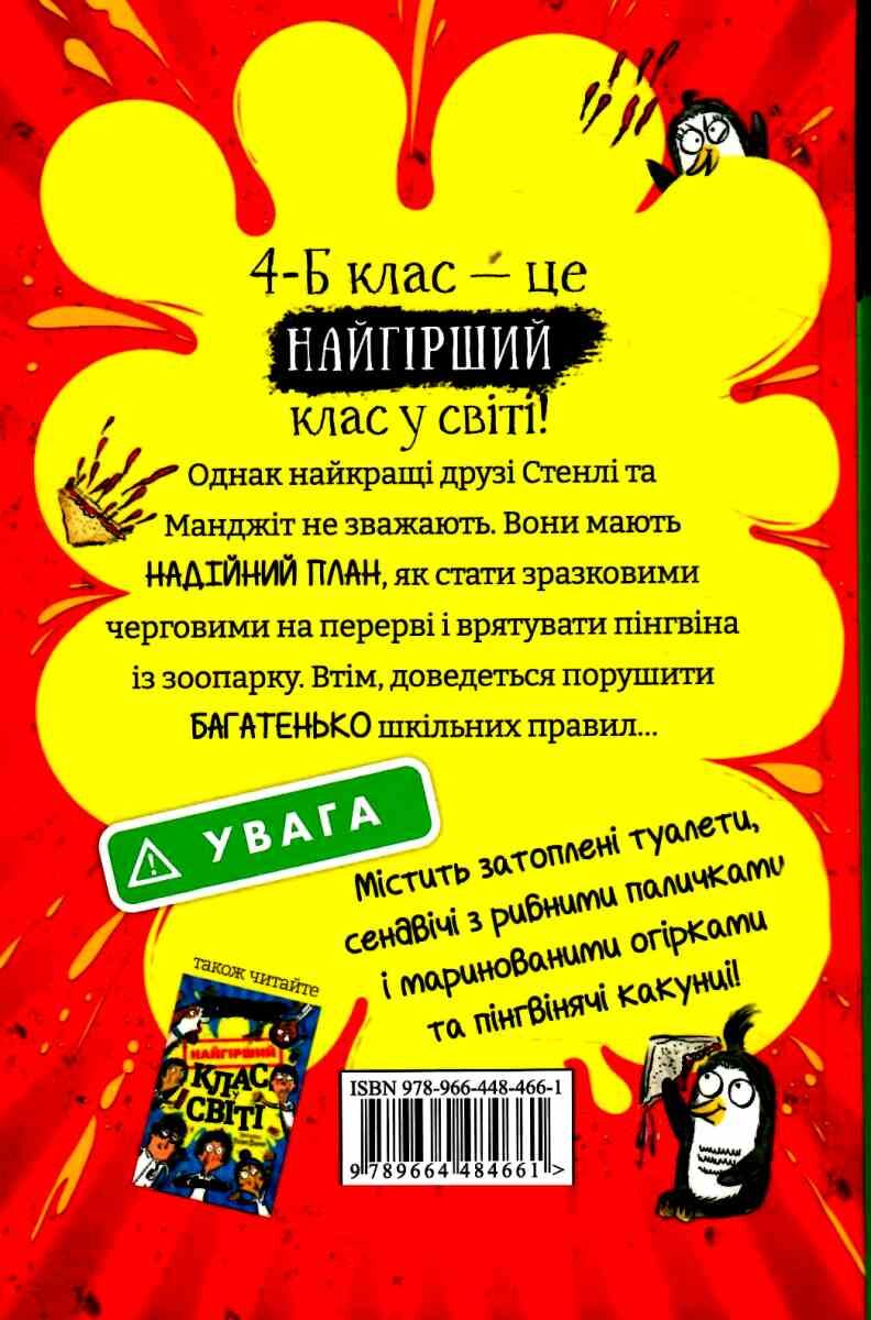 Директорка школи каже, що 4-Б — НАЙГІРШИЙ КЛАС У СВІТІ. Та чи може він стати ще гіршим? Що за питання? Звісно ж, може! Малі бешкетники вкотре доводять, що з них БУКВАЛЬНО не можна зводити очей, адже вони вміють зчинити ГАРМИДЕР з нічого — і не має значення, де саме: на шкільному майданчику чи на екскурсії в зоопарку. Що найбільше постраждає цього разу? Шкільне майно? Випадковий пінгвін? Чи й без цього підмочена репутація 4-Б класу?