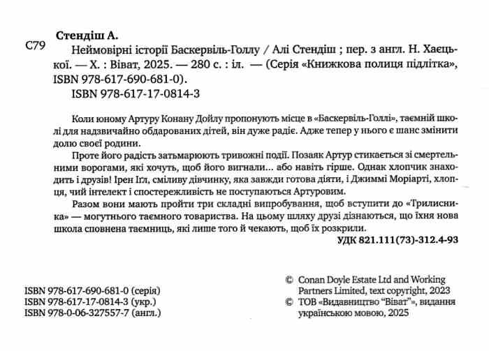Коли юному Артуру Конану Дойлу пропонують місце в «Баскервіль-Голлі», таємній школі для надзвичайно обдарованих дітей, він дуже радіє. Адже тепер у нього є шанс змінити долю своєї родини. Проте його радість затьмарюють тривожні події. Позаяк Артур стикається зі смертельними ворогами, які хочуть, щоб його вигнали... або навіть гірше. Однак хлопчик знаходить і друзів! Ірен Іґл, сміливу дівчинку, яка завжди готова діяти, і Джиммі Моріарті, хлопця, чий інтелект і спостережливість не поступаються Артуровим. Разом вони мають пройти три складні випробування, щоб вступити до «Трилисника» — могутнього таємного товариства. На цьому шляху друзі дізнаються, що їхня нова школа сповнена таємниць, які лише того й чекають, щоб їх розкрили.