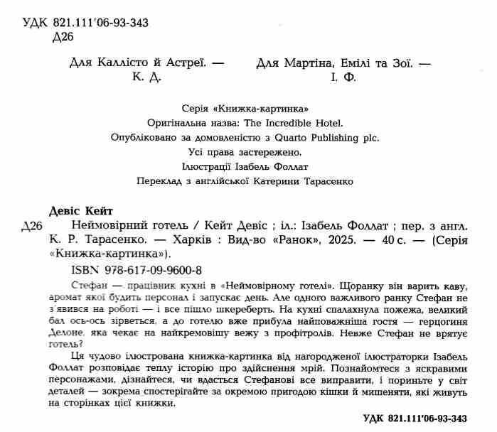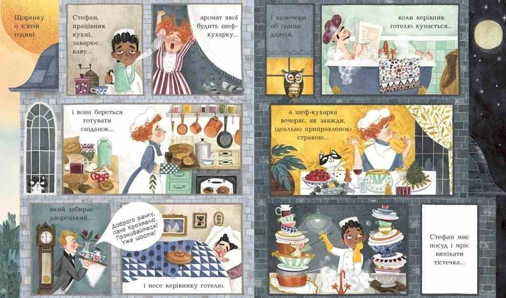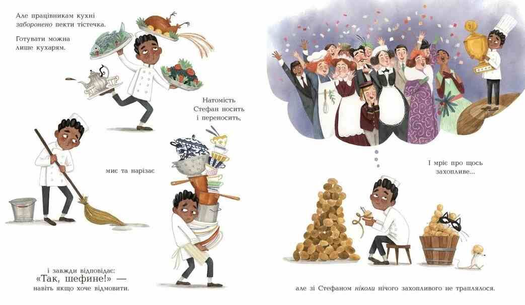 Стефан — працівник кухні в «Неймовірному готелі». Щоранку він варить каву, аромат якої будить персонал і запускає день. Але одного важливого ранку Стефан не з’явився на роботу — і все пішло шкереберть. На кухні спалахнула пожежа, великий бал ось-ось зірветься, а до готелю вже прибула найповажніша гостя — герцогиня Делоне, яка чекає на найкремовішу вежу з профітролів. Невже Стефан не врятує готель?Ця чудово ілюстрована книжка-картинка від нагородженої ілюстраторки Ізабель Фоллат розповідає теплу історію про здійснення мрій. Познайомтеся з яскравими персонажами, дізнайтеся, чи вдасться Стефанові все виправити, і пориньте у світ деталей — зокрема спостерігайте за окремою пригодою кішки й мишеняти, які живуть на сторінках цієї книжки.