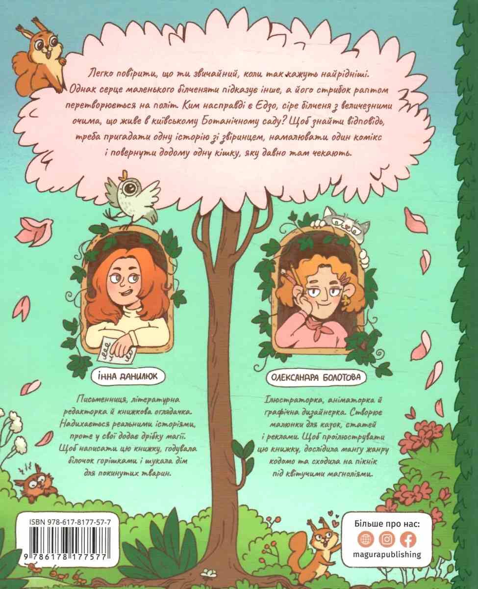 Легко повірити, що ти звичайний, коли так кажуть найрідніші. Однак серце маленького білченяти підказує інше, а його стрибок раптом перетворюється на політ. Ким насправді є Едзо, сіре білченя з величезними очима, що живе в київському Ботанічному саду? Щоб знайти відповідь, треба пригадати одну історію зі звіринцем, намалювати один комікс і повернути додому одну кішку, яку давно там чекають.