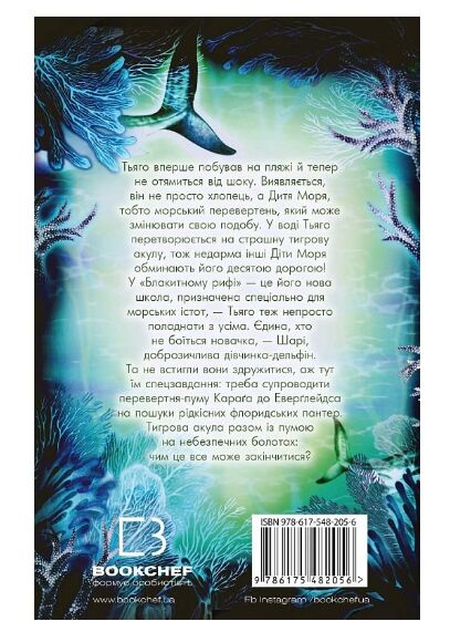 Тьяго вперше побував на пляжі й тепер не отямиться від шоку. Виявляється, він не просто хлопець, а Дитя Моря, тобто морський перевертень, який може змінювати свою подобу. У воді Тьяго перетворюється на страшну тигрову акулу, тож недарма інші Діти Моря обминають його десятою дорогою! У «Блакитному рифі» — це його нова школа, призначена спеціально для морських істот, — Тьяго теж непросто поладнати з усіма. Єдина, хто не боїться новачка, — Шарі, доброзичлива дівчинка-дельфін. Та не встигли вони здружитися, аж тут їм спецзавдання: треба супроводити перевертня-пуму Караґа до Еверґлейдса на пошуки рідкісних флоридських пантер. Тигрова акула разом із пумою на небезпечних болотах: чим це все може закінчитися?