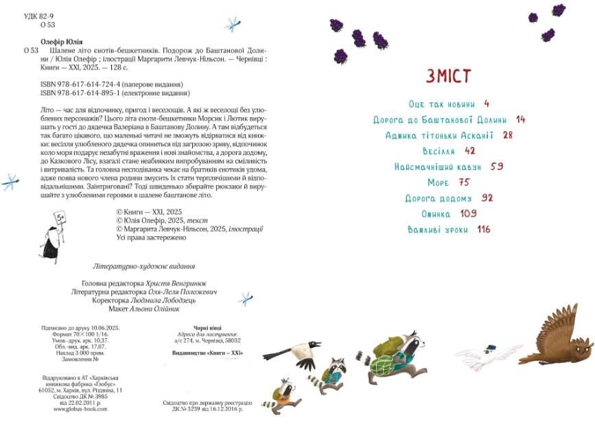 Шалене літо єнотів-бешкетників. Подорож до Баштанової Долини — повна назва книжки. Літо — час для відпочинку, пригод і веселощів. А які ж веселощі без улюблених персонажів? Цього літа єноти-бешкетники Морсик і Лютик вирушать у гості до дядечка Валеріана в Баштанову Долину. А там відбудеться так багато цікавого, що маленькі читачі не зможуть відірватися від книжки: весілля улюбленого дядечка опиниться під загрозою зриву, відпочинок коло моря подарує незабутні враження і нові знайомства, а дорога додому, до Казкового Лісу, взагалі стане неабияким випробуванням на сміливість і витривалість. Та головна несподіванка чекає на братиків єнотиків удома, адже поява нового члена родини змусить їх стати терплячішими й відповідальнішими. Заінтриговані? Тоді швиденько збирайте рюкзаки й вирушайте з улюбленими героями в шалене баштанове літо.