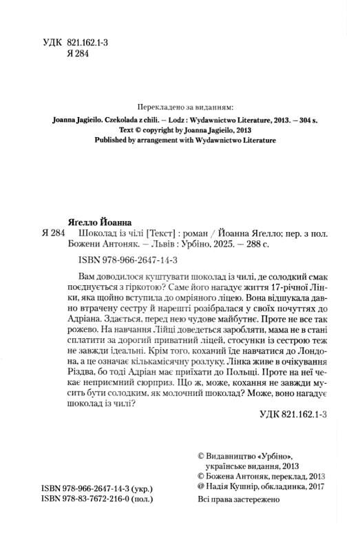 Вам доводилося куштувати шоколад із чилі, де солодкий смак поєднується з гіркотою? Саме його нагадує життя 17-річної Лінки, яка щойно вступила до омріяного ліцею. Вона відшукала давно втрачену сестру й нарешті розібралася у своїх почуттях до Адріана. Здається, перед нею чудове майбутнє. Проте не все так рожево. На навчання Лінці доведеться заробляти, мама не в стані сплатити за дорогий приватний ліцей, стосунки із сестрою теж не завжди ідеальні. Крім того, коханий їде навчатися до Лондона, а це означає кількамісячну розлуку. Лінка живе в очікування Різдва, бо тоді Адріан має приїхати до Польщі. Проте на неї чекає неприємний сюрприз. Що ж, може, кохання не завжди мусить бути солодким, як молочний шоколад? Може, воно нагадує шоколад із чилі?