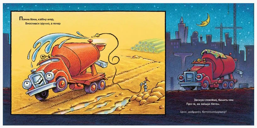 Ох і напрацювалися за день сумлінні машини: вантажний кран, бетонозмішувач, самоскид, бульдозер і екскаватор. Настав час відпочинку, будівництво засинає. Уперше українською бестселер NewYorkTimes — найкраща «сонна» книжка для малечі «Спи міцно, моє будівництво».