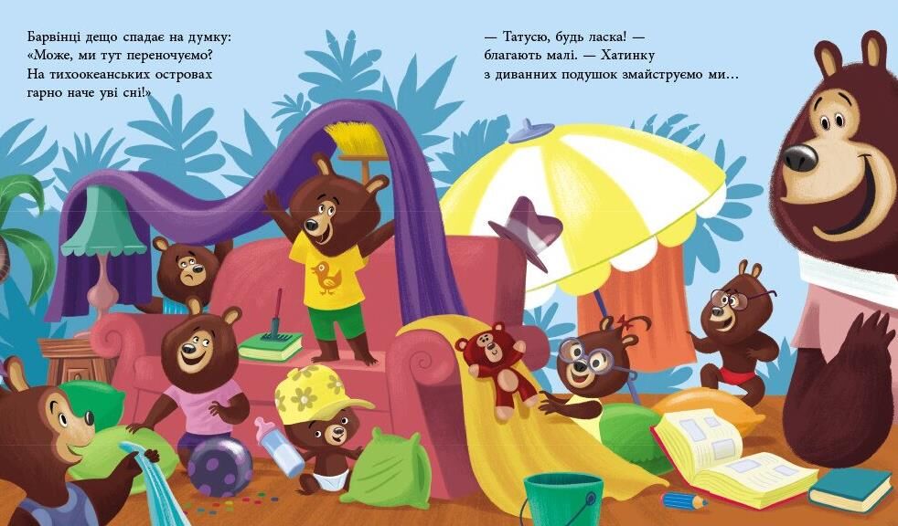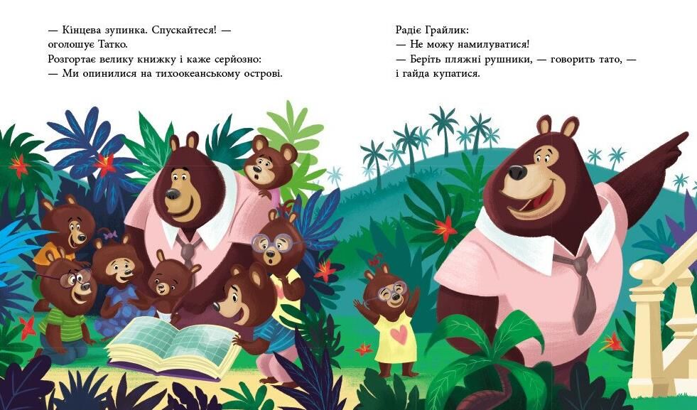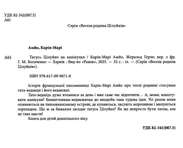 Книга Татусь Цілуйко на канікулах — це зворушлива історія від відомої французької письменниці Карін-Марі Амйо, яка уже давно здобула популярність серед батьків і малечі за свої щирі та добрі оповідання. Цього разу авторка запрошує маленьких читачів у чарівну пригоду разом з татом-ведмедем та його непосидючими ведмежатами.Про сюжет Після важкого дня тато-ведмідь вирішує, що настав час відпочити. І не просто вдома, а справжнісінький відпочинок на теплому острові посеред Тихого океану. Разом зі своїми малюками вони вирушають у казкову подорож, де на них чекають смачне морозиво, купання, зорепади й багато веселощів. Кожна сторінка цієї дитячої книжки наповнена теплом, любов’ю та гумором. Це чудова можливість показати дітям, наскільки важливими є родинні стосунки, підтримка й спільний відпочинок.
