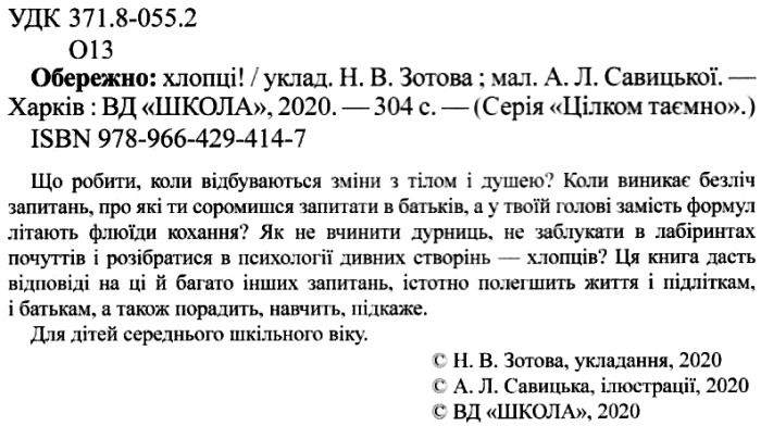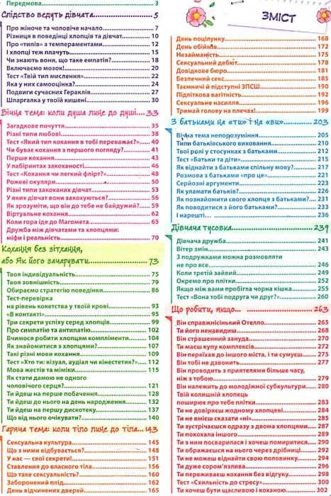 Що робити, коли відбуваються зміни з тілом і душею? Коли виникає безліч запитань, про які ти соромишся запитати в батьків, а у твоїй голові замість формул літають флюїди кохання? Як не вчинити дурниць, не заблукати в лабіринтах почуттів і розібратися в психології дивних створінь — хлопців? Ця книга дасть відповіді на ці й багато інших запитань, істотно полегшить життя і підліткам, і батькам, а також порадить, навчить, підкаже.