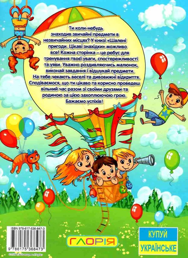 Ти коли-небудь знаходив звичайні предмети в незвичайних місцях? У книзі «Шалені пригоди. Цікаві знахідки» можливо все! Кожна сторінка – це ребус для тренування твоєї уваги, спостережливості та уяви. Уважно роздивляючись малюнок, виконай завдання і відшукай предмети. На тебе чекають веселі та дивовижні відкриття.