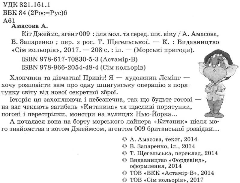 амасова кіт джеймс агент 009 книга купити ціна купить цена "Сім кольорів"