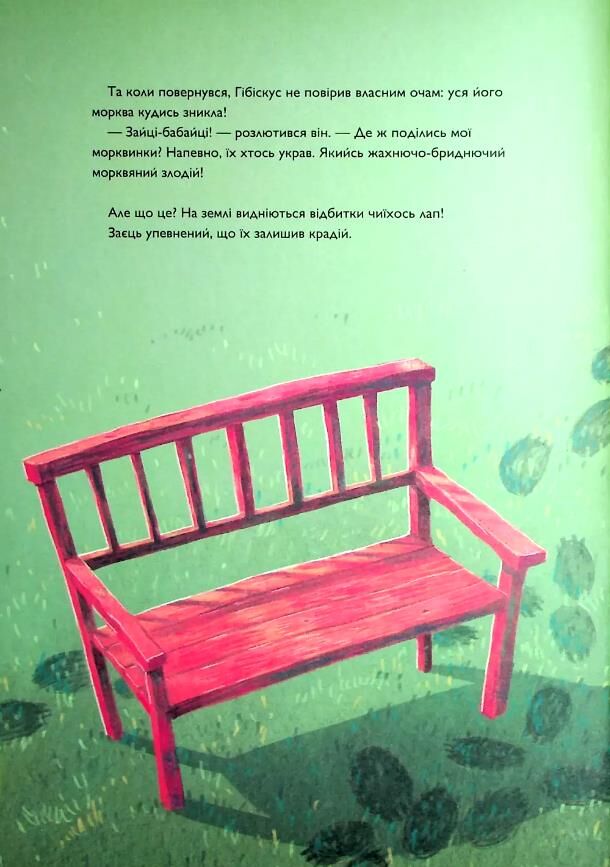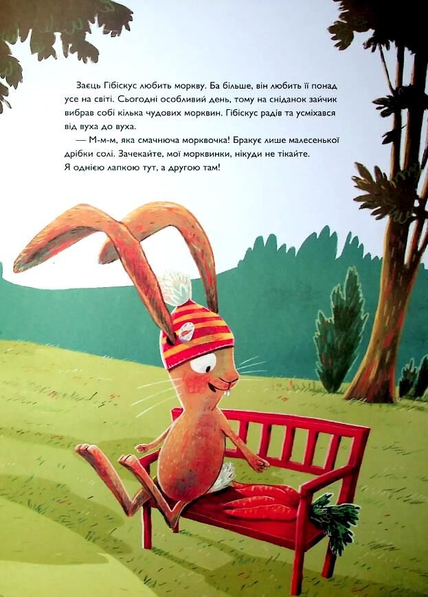 Заєць Гібіскус святкує день народження. l на сніданок сьогодні він, звісно, приготував свою улюблену морквочку. Та що це? Варто було на мить відволіктися, як моркву хтось поцупив! Заєць вирушає на пошуки злодія по гарячих слідах. Хто з лісових мешканців здатен на такий підступний вчинок? Віслюк Фред? Але відбитки його копит зовсім інші. Сова Улі? Вона ж має крила й легко б улетіла з місця злочину. А найдивніше — сліди знову приводять Гібіскуса до власної хатинки…