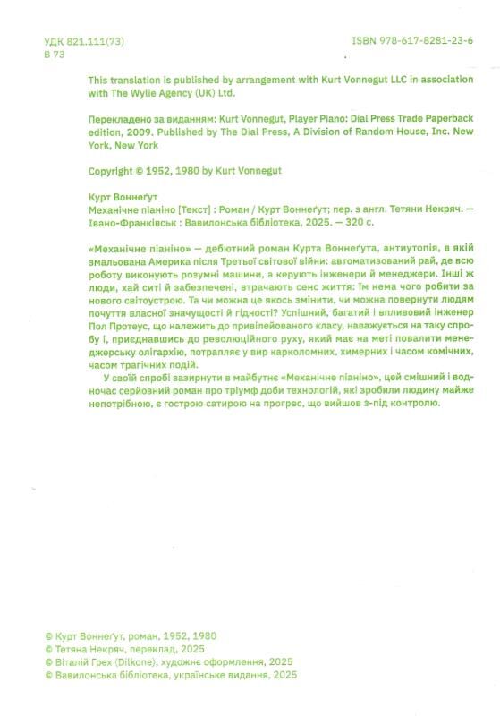 «Механічне піаніно» — дебютний роман Курта Воннеґута, антиутопія, в якій змальована Америка після Третьої світової: автоматизований рай, де всю роботу виконують розумні машини, а керують інженери й менеджери. Інші ж люди, хай ситі й забезпечені, втрачають сенс життя: їм нема чого робити за нового світоустрою. Та чи можна це якось змінити, чи можна повернути людям почуття власної значущості й гідності? Успішний, багатий і впливовий інженер Пол Протеус, що належить до привілейованого класу, наважується на таку спробу й, приєднавшись до революційного руху, який має на меті повалити менеджерську олігархію, потрапляє у вир карколомних...