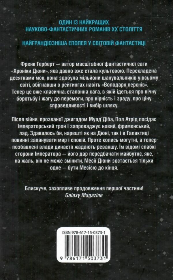 Найграндіозніша епопея у світовій фантастиці. Один із найкращих науково-фантастичних романів ХХ століття. Після війни, прозваної джигадом Муад'Діба, Пол Атрід посідає імператорський трон і запроваджує новий, фрименський, лад. Здавалось би, нарешті як на Дюні, так і в Галактиці повинні запанувати мир і спокій. Проте колись могутні, а тепер позбавлені влади династії жадають реваншу. Їм відомі слабкі сторони Імператора - його дар передбачати майбутнє, яке, на жаль, він не може змінити. Месії Дюни зостається тільки одне - бути Месією до кінця. "Блискуче, захопливе продовження першої частини!" Galaxy Magazine Про автора: Френк Герберт - автор масштабної фантастичної саги "Хроніки Дюни", яка давно вже стала культовою. Перекладена десятками мов, вона здобула мільйони шанувальників у всьому світі, обігнавши в рейтингах навіть "Володаря перснів". Тепер це вже класична, еталонна сага, в якій ідеться про вічну боротьбу і жагу до перемоги, про вірність і зраду, про ціну справедливості і вибір шляху.