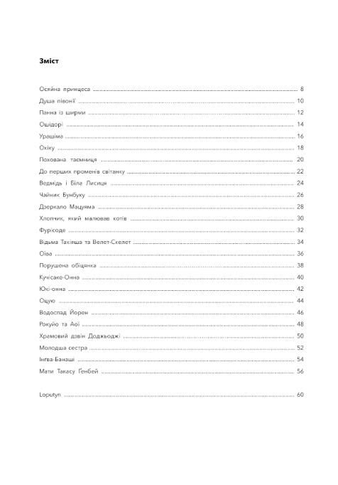 Краса, що лякає. Легенди, від яких холоне всередині. Принцеса-відьма Такіяша та лисиця-перевертень Кіцуне, ревниві духи та привиди, поховані таємниці та бажання, за які доводиться платити надто високу ціну, — у цих історіях японський фольклор постає темним, поетичним і невблаганним. Loputyn переосмислює 25 класичних японських легенд у власній, впізнаваній манері: ніжні образи приховують жорстокі сюжети, а витончена графіка — тривожні історії про втрату, помсту, страх і пристрасть. Це книга, у якій ілюстрація й текст зливаються в єдине закляття — красиве, небезпечне і від якого неможливо відвести погляд.