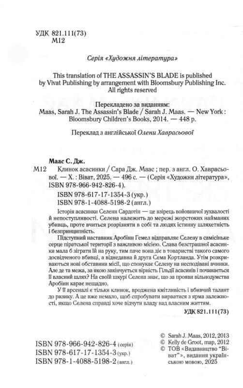 Історія асасинки Селени Сардотін — це взірець войовничої зухвалості й непоступливості. Селена належить до мережі жорстоких найманих убивць, проте вчиться розрізняти в собі та людях істинну шляхетність і безпринципність. Підступний наставник Аробінн Гемел відправляє Селену в самісіньке серце піратської території з важливою місією. Слава безстрашної асасин- ки мала б зіграти їй на руку, тим паче вона діє в товаристві такого самого досвідченого вбивці, а віднедавна й друга Сема Кортланда. Утім розкри- ваються нові обставини місії, що спонукає Селену на несподівані вчинки. Але де та межа, за якою закінчується вірність Гільдії асасинів і починається її власний шлях? На своїй шкурі Селена знає, що за прояви вільнодумства Аробінн карає нещадно. У її арсеналі є тільки клинок, вроджена кмітливість і вбивчий талант до ризику. А це вже немало, щоб спробувати вирватися з ярма залежно- сті, якщо Селена справді хоче відчути владу над власним життям.