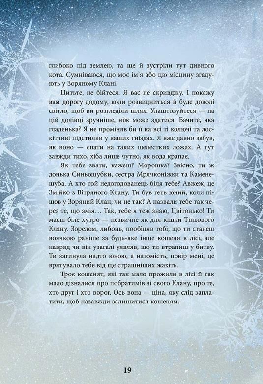 Подарункове кольорове видання-путівник стане справжньою окрасою колекції шанувальника серії. Опинившись десь у темряві на краю території Зореклану, Морошка, Цвітонька і Змійко натрапляють на дивного кота. Навряд чи Зоряні вояки згадують його ім’я. Утім безшерстий незрячий дух Скеля не несе загрози, навпаки: щойно розвидниться, він неодмінно покаже кошенятам дорогу додому. А до того… До того він повідає їм нечувані історії видатних котів вояцького світу. І таким чином закарбує їхні імена і долі в пам’яті всіх, хто про них почує. І прочитає.