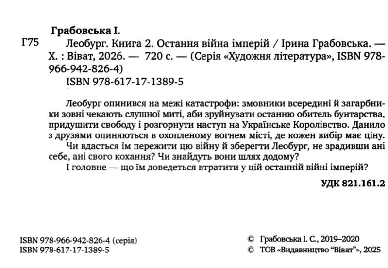 «Остання війна імперій» — це завершальний роман дилогії «Леобург» від сучасної української авторки Ірини Грабовської. Крихка рівновага порушена: волелюбне місто от-от стане полем бою між двома державами й втратить свої величні обриси. Жителі Леобурга розгублені й збентежені, але їхня глибока занепокоєність не зрівняється із силою прагнення захищати свій рідний край. Вони готові протистояти жорстокій реальності, навіть якщо за перемогу доведеться заплатити найдорожчим — власною кров'ю.