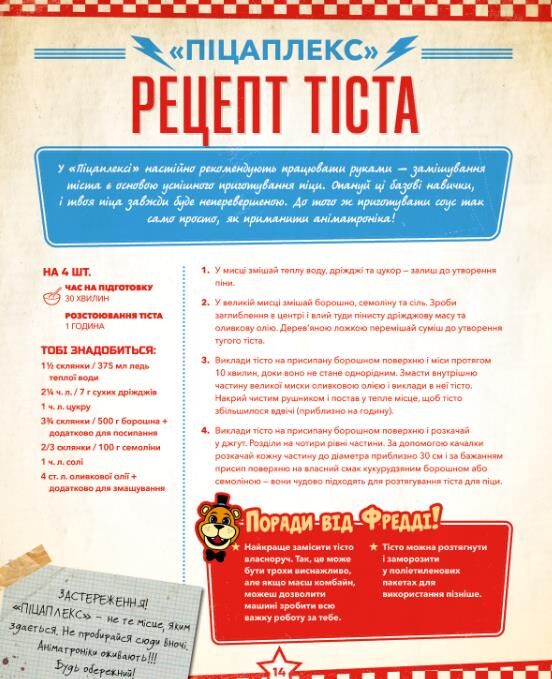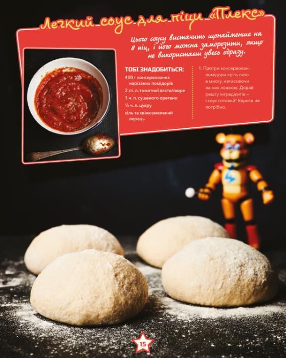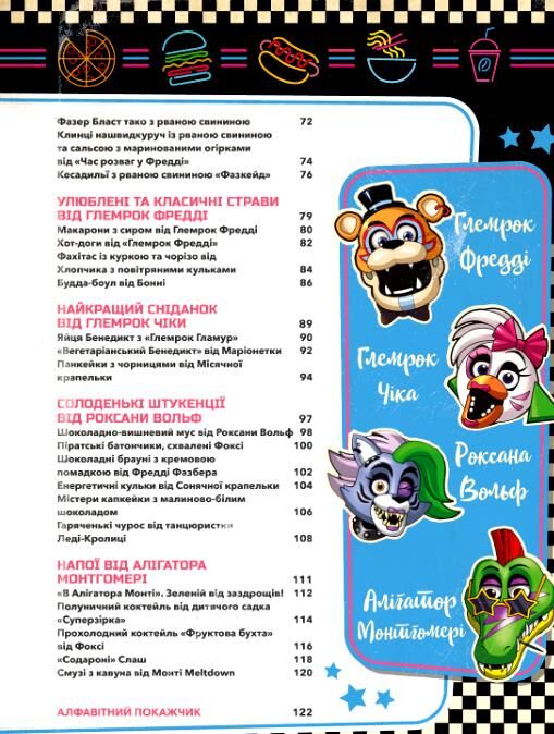 Ця збірка рецептів із моторошного всесвіту Five Nights at Freddy’s розкриває, що кожна страва має власну історію… і, можливо, темну таємницю. У книзі зібрано частування, які могли б подаватися в легендарному закладі «Піцаплекс» — від класичної сирної піци до фірмових страв із секретними інгредієнтами від Фредді, Чіки, Фоксі, Бонні, Роксани Вольф та Монтгомері.