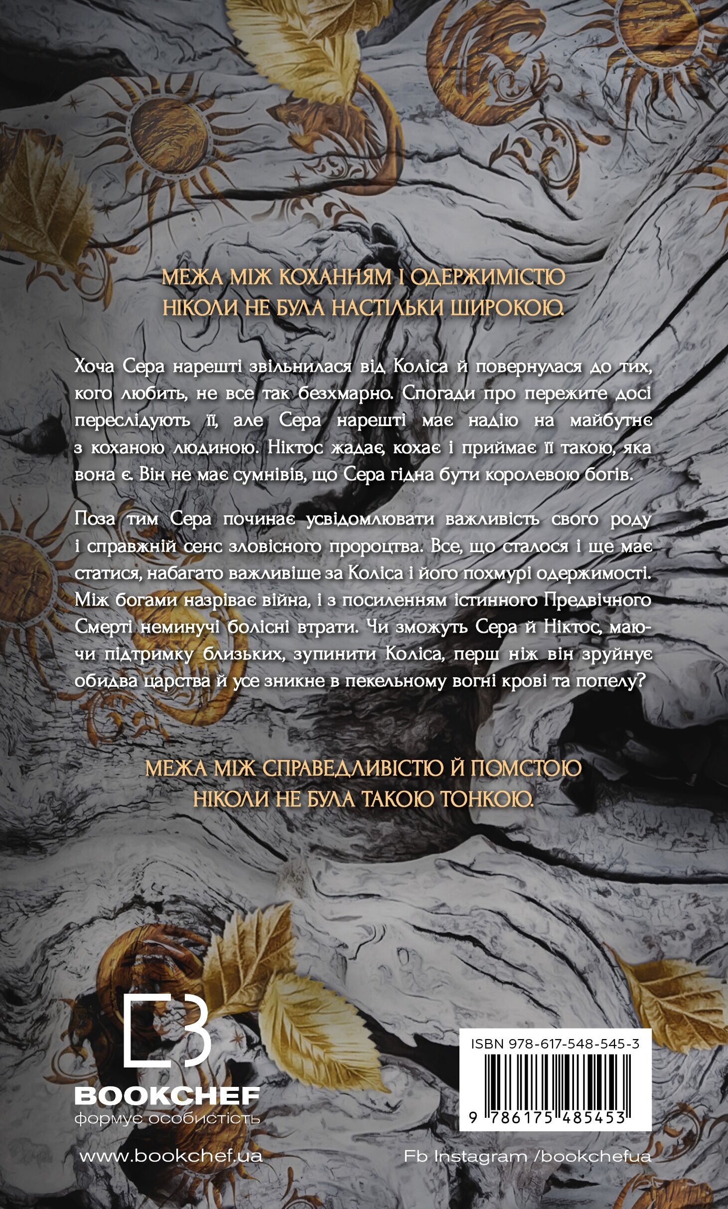 Межа між коханням і одержимістю ніколи не була настільки широкою. Хоча Сера нарешті звільнилася від Коліса й повернулася до тих, кого любить, не все так безхмарно. Спогади про пережите досі переслідують її, але Сера нарешті має надію на майбутнє з коханою людиною. Ніктос жадає, кохає і приймає її такою, яка вона є. Він не має сумнівів, що Сера гідна бути королевою богів. Поза тим Сера починає усвідомлювати важливість свого роду і справжній сенс зловісного пророцтва. Все, що сталося і ще має статися, набагато важливіше за Коліса і його похмурі одержимості. Між богами назріває війна, і з посиленням істинного Предвічного Смерті неминучі болісні втрати. Чи зможуть Сера й Ніктос, маючи підтримку близьких, зупинити Коліса, перш ніж він зруйнує обидва царства й усе зникне в пекельному вогні крові та попелу? Межа між справедливістю й помстою ніколи не була такою тонкою.