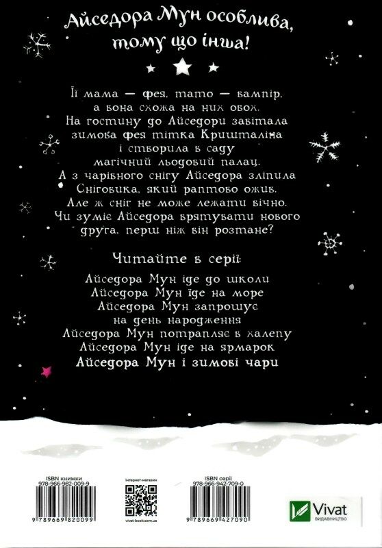 ЇЇ мама - фея, тато - вампiр, а вона схожа на них обох. На гостину до Айседори завiтала зимова фея тiтка Кришталiна i створила в саду магiчний льодовий палац. А з чарiвного снiгу Айседора злiпила Снiговика, який раптово ожив. Але ж снiг не може лежати вiчно. Чи зумi Айседора врятувати нового друга, перш нiж вiн розтане?