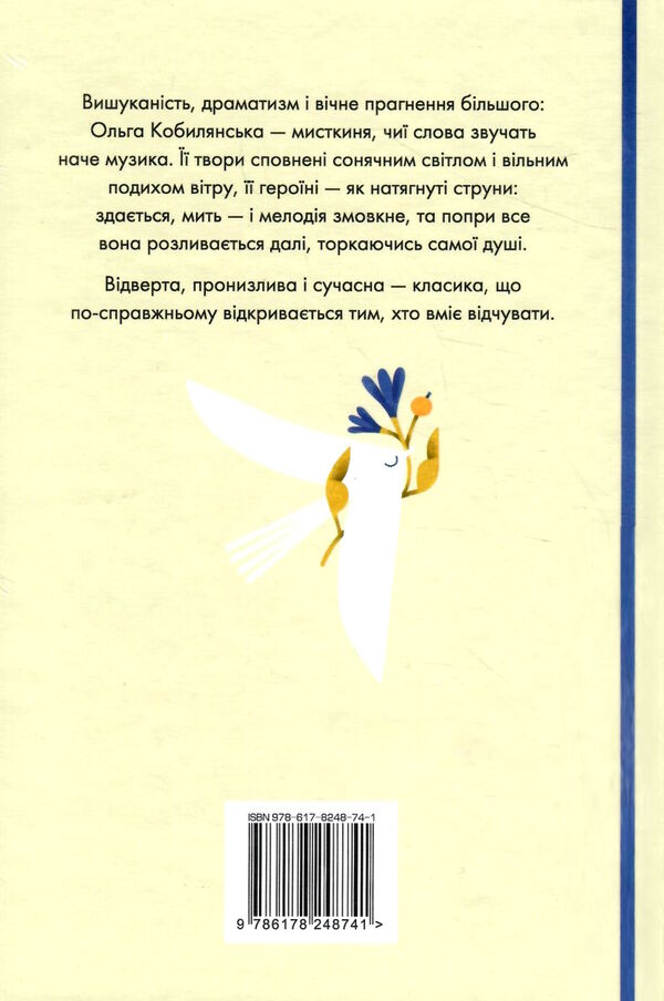 Вишуканість, драматизм і вічне прагнення більшого: Ольга Кобилянська — мисткиня, чиї слова звучать наче музика. Її твори сповнені сонячним світлом і вільним подихом вітру, її героїні — як натягнуті струни: здається, мить — і мелодія змовкне, та попри все вона розливається далі, торкаючись самої душі. Відверта, пронизлива і сучасна — класика, що по-справжньому відкривається тим, хто вміє відчувати.