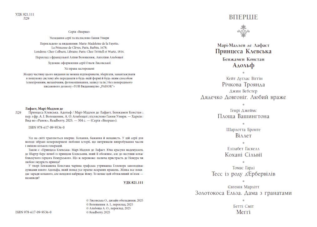 Принцеса Клевська Мадемуазель де Шартр бере шлюб із принцом Клевським, який її обожнює. Та коли зустрічається із блискучим герцогом Немурським, закохується до нестями. Немає іншого вибору, окрім відкритися принцові... Тепер слід чекати, що переможе: нестримний потяг до коханого чи любов і шляхетність чоловіка. Адольф Чарівна графська утриманка Елленора заволодіває думками юного аристократа Адольфа, і невдовзі вони вже не можуть опиратися хвилі почуттів. Вона все покинула заради нього. То невже цей зв’язок — назавжди?
