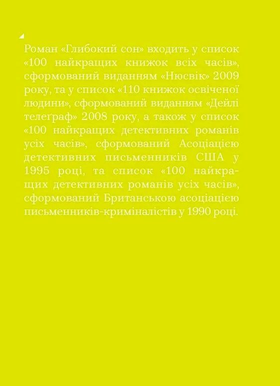 Роман переносить нас у Сполучені Штати періоду Великої депресії. Старий, багатий і прикутий до візка генерал Стернвуд наймає детектива для розслідування випадку шантажу, пов’язаного з однією з двох його відчайдушних доньок. Філіп Марлоу береться за справу і спускається в освітлене неоновими вогнями саме пекло Лос-Анджелеса, де панують найпопулярніші гріхи середини двадцятого століття: азартні ігри, алкоголізм, вбивства, контрабанда, корупція, наркоманія, рекет, розпуста, шантаж. «Глибокий сон» — класика крутого детективу і жанру нуар.