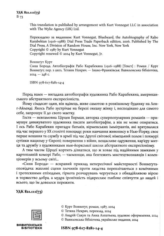 Перед вами вигадана автобіографія американського художника Рабо Карабекяна. Йому сімдесят один, він вдівець, живе самотою в розкішному будинку на Лонґ-Айленді. Якось Рабо зустрічає на березі океану жінку і, несподівано для самого себе, запрошує її до свого маєтку.