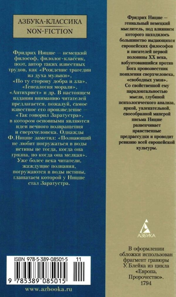 Філософський роман «Так мовив Заратустра» — центральний твір німецького мислителя Фрідріха Вільгельма Ніцше, що розділив його творчість на дві частини — позитивну, стверджуючу ідеал надлюдини, і негативну, або етап «переоцінки усіх цінностей». Саме в цій роботі Ніцше висуває ідеал надлюдини, висловивши тим самим своє переконання в тому, що культурне самовдосконалення — це і є найголовніша моральна цінність, і в результаті його має з’явитися нова людина, що перевершить сучасників своїми морально-інтелектуальними якостями. Книга являє собою частково поетичний, частково філософський трактат, де розкривається позиція самого Ніцше відносно місця людини у суспільстві, розуміння життя, подорожей, пізнання себе і навколишнього світу, підкреслюється необхідність прямування власним шляхом