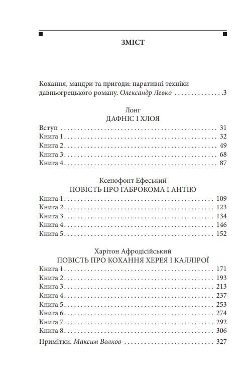 До видання «Давньогрецький роман» увійшли такі твори: «Дафніс і Хлоя» Лонга, «Повість про Габрокома і Антію» Ксенофонта Ефеського та «Повість про кохання Херея і Каллірої» Харітона Афродісійського. Основні теми романів — кохання і вірність, спокуси та стійкість перед випробуваннями, мінливість людського щастя тощо. Мають спільні сюжетні риси: описують кохання молодих людей виняткової вроди, їхні страждання, мандри та пригоди. Глибина змісту, майстерність оповіді, а також барвиста мова робить ці твори вартими уваги читачів.