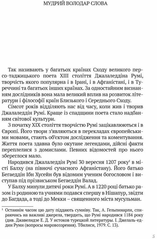 До книжки вибраних поезій Джалаледдіна Румі (1207– 1273) – одного з найвизначніших представників персо-таджицької літератури – ввійшли його ліричні твори, притчі, газелі та рубаї, які вплинули на розвиток літератури епохи Середньовіччя. Основне місце у пропонованому виданні займають притчі з поеми «Маснаві-йе Манаві», в яких знайшли свій відбиток особистий життєвий досвід поета і філософа та глибина народної мудрості. Твори Румі користуються широкою популярністю і перекладені багатьма мовами світу.