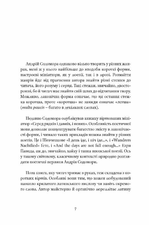 У цій книжці чи не вперше в нашій літературі поряд з українськими звучать вписані в тексти поетичних мініатюр латинські слова, вислови, афоризми. У їх гармонійному співзвуччі відлунюють започатковані ще в гомерівські часи вічні теми, в яких – жива тяглість людських думок, образів, почуттів (про це – в коментарях).