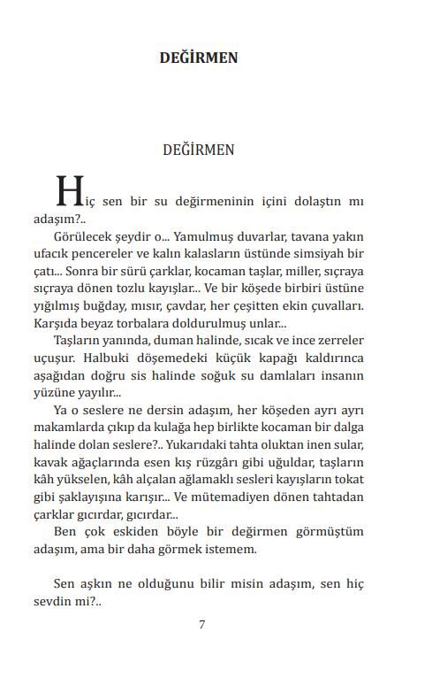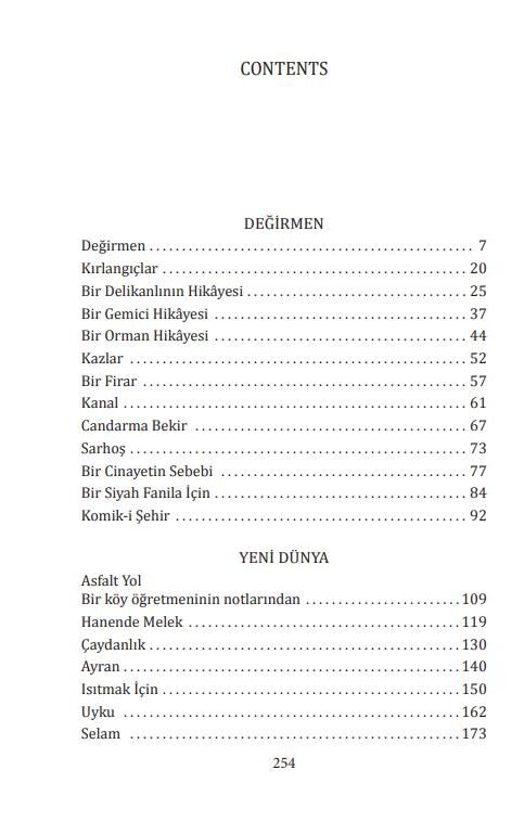 Bu kitapta yazarın kalemine ait olan ‘Değirmen’ (1935) ve ‘Yeni Dünya’ (1943) adlı öykü kitaplarından bazı öyküler yer almaktadır.