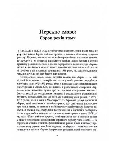 «Світ очима Ґарпа» — шедевр Джона Ірвінга, найвідоміший із його романів, присвячений творчості, вільному коханню, емансипації та батьківській параної. Завдяки цій книжці, повній сарказму, темного гумору та глибокого розуміння природи людських станів, Джон Ірвінг став американською культурною іконою, а сам роман на початку 1980-х років породив такий феномен, як «ґарпоманія». З одного боку, «Світ очима Ґарпа» — це, за словами самого автора, сімейна сага, приправлена міркуваннями про природу творчої уяви, але водночас це епічна розповідь про жорстокі сторони сучасного життя, у яких межі поміж трагедією та комедією практично розмиті, і лише мистецтво допомагає героям упоратися зі спалахами нетерпимості та сліпої ненависті.