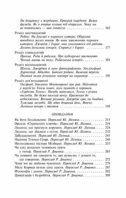 Англійський письменник, журналіст, драматург і гуморист Джером Клапка Джером (1859–1927) — тонкий спостерігач людської натури. Його твори пережили свій час і тішать нас гумором. Якщо ви бажаєте дістати заряд гарного настрою, то пропонуємо прочитати повість «Троє в одному човні (як не рахувати собаки)». Ви зможете дізнатися, як не скинути з човна напарника та не облити водою пасажирок; як ставити вітрило; як, гойдаючись на хвилях, приготувати яєчню. Несподіваний комізм, що інколи доходить до абсурду, притаманний більшості оповідань цієї книжки. Ростислав Доценко (1931–2012) подарував українському читачеві зразкові переклади, зокрема творів Джерома Клапки Джерома. За часів радянського тоталітаризму, долаючи перепони цензури, він впевнено увійшов до когорти найкращих сучасних тлумачів. Політв’язень ГУЛАГу в 1953–1963 роках, правозахисник, упродовж 1964–2012 років був активним учасником українського літературного процесу.